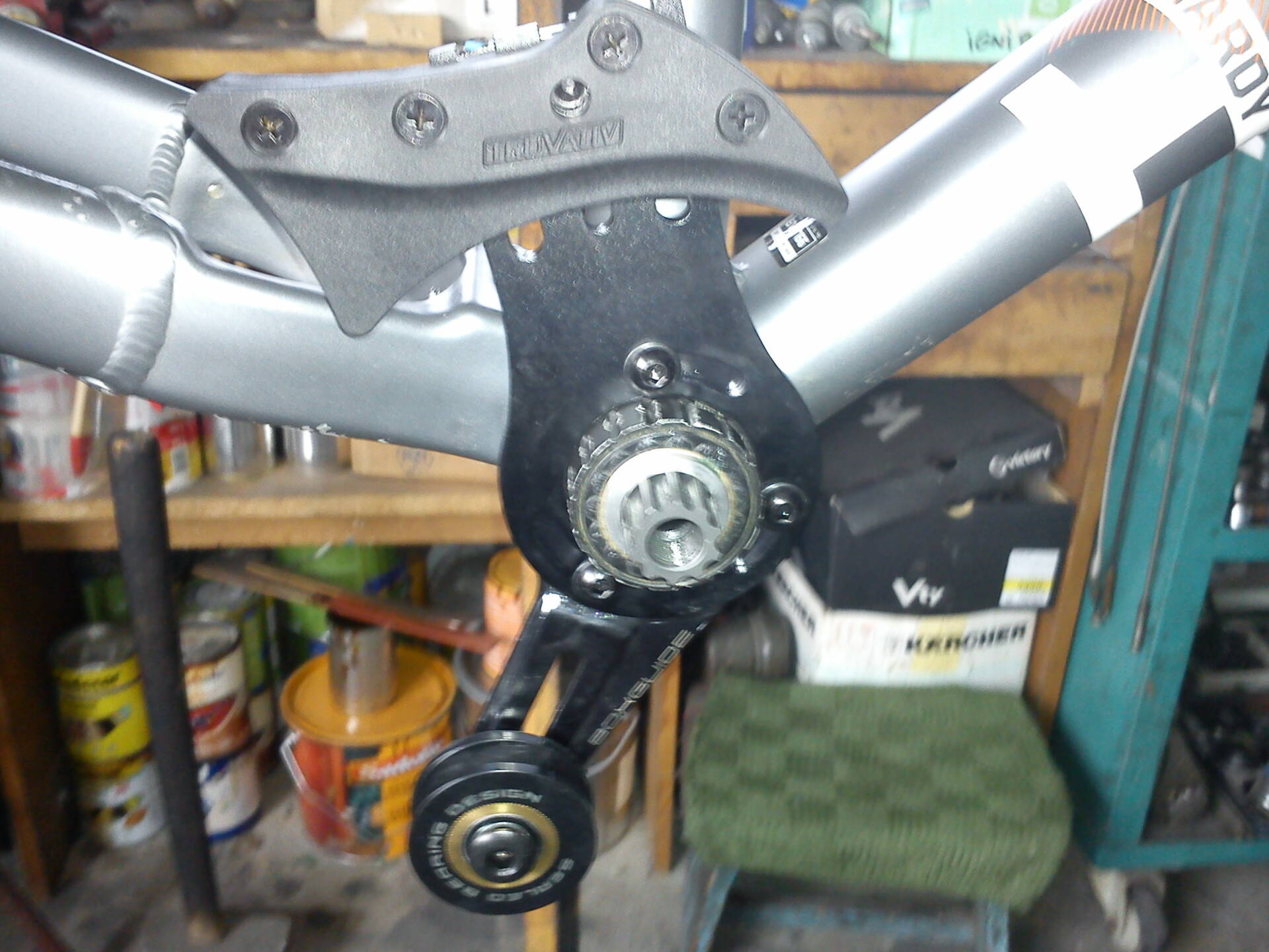 Tévedés ne essék, ez nem iscg-s, ez is mono alá van betéve, viiszont a hajtókaron a kis tányér csavarjának a helye beleütött ebbe a 3 csavarba amit láttok a vezetőn, úgy hogy a hajtókarról le kellett vágnom a csavarok helyét, de nem bánom megérte:)