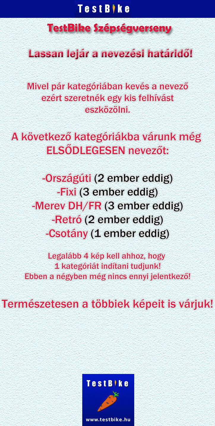 Csak óvatosan.:) Legkésőbb szombaton küldök fixi kategóriába egy csinos darabot. Tudtommal az még határidőn belül van. (Vártam, hátha havazik errefelé/bukta/, hétköznap meg sötétben érek haza mindig)
