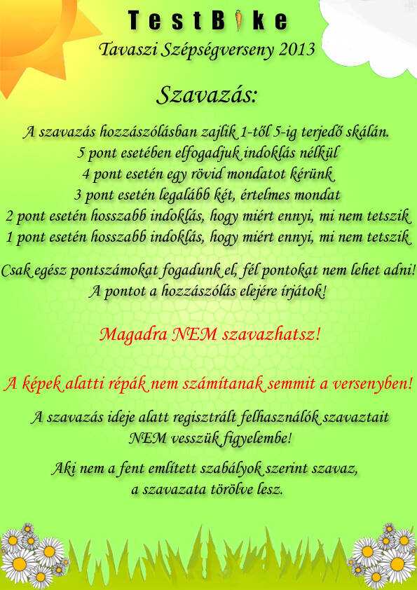 @máté-kiss: Mivel képet küldesz be, így a kép is számít. Ha veszünk 2 XC bringát ami teljesen ugyan olyan, akkor ugyan annyi pontot fogsz adni arra a képre is, ami a disznóólban készült, mint arra, ami a hegyen?