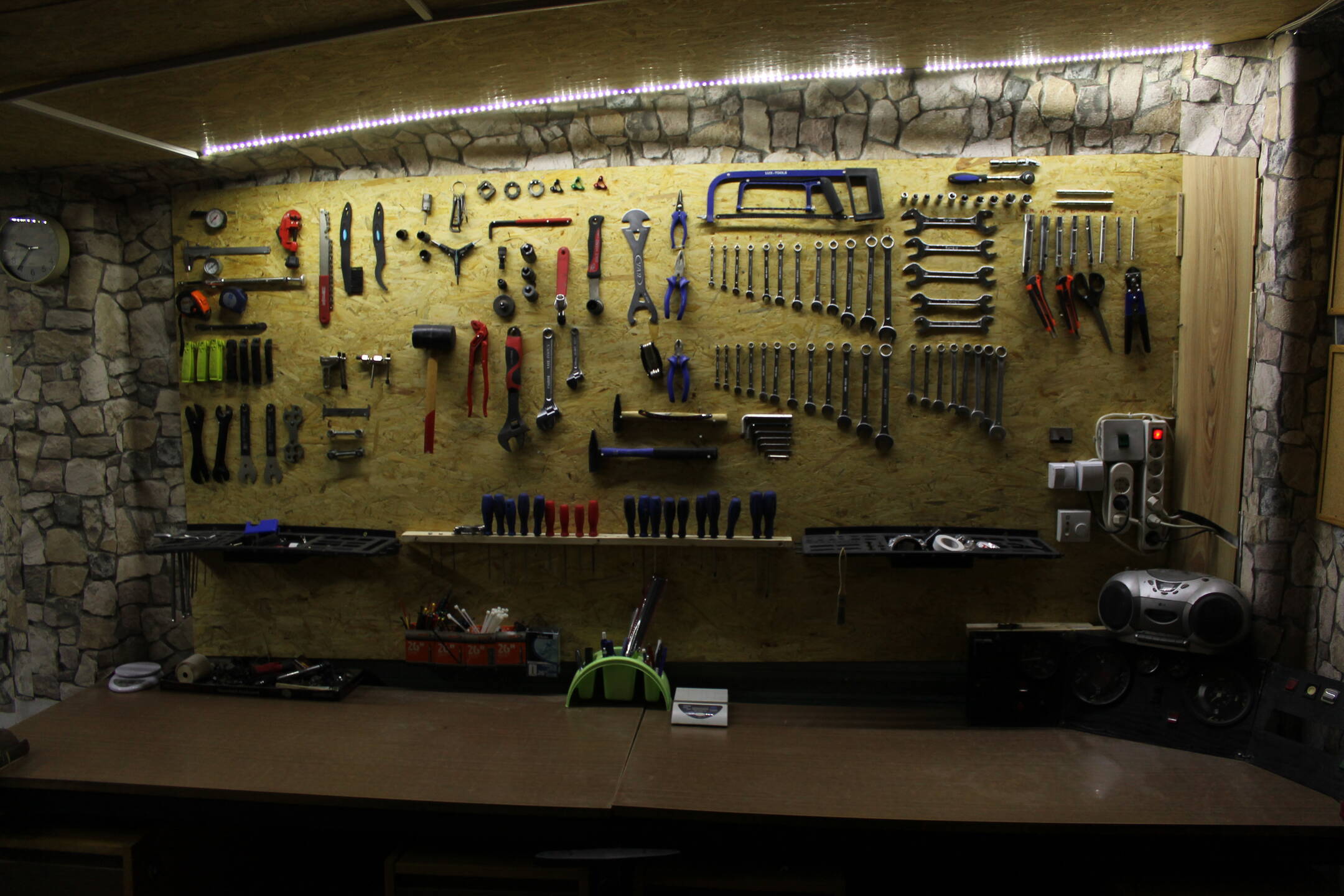 Nagyon szép szerszámfal! Látszik, hogy szeret kerékpárokkal mókolni a tulajdonosa :D. A LED sor fénye kevésnek tűnik az asztalon való munkához, de lehet, hogy csak a fénykép hibája. Én egyszer meguntam a félhomályt és felszúrtam a satupad fölé egy 2 x 58W-os armatúrát elektronikus előtéttel :).