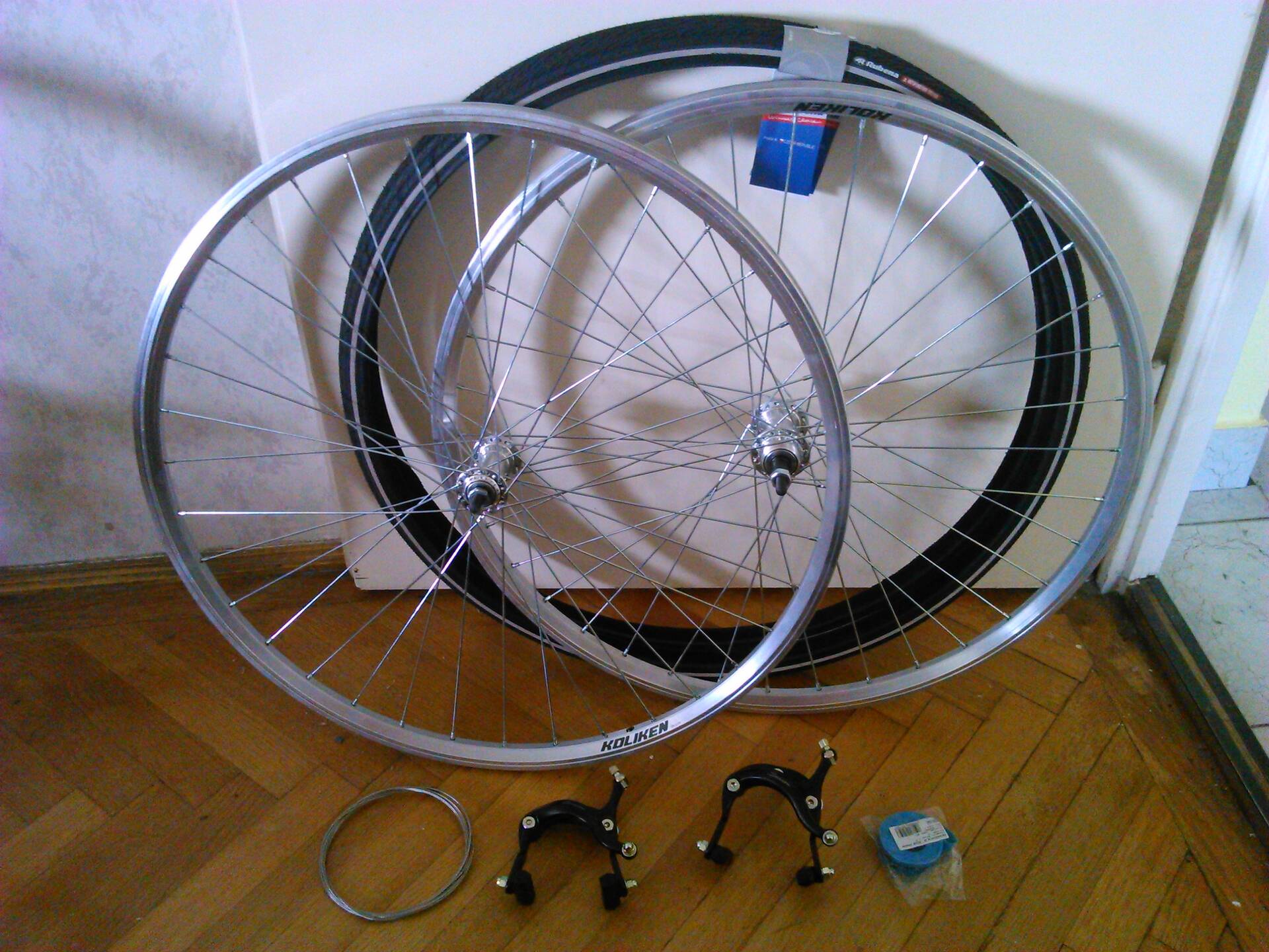 Új kerék (622-es Koliken felni, Asses agy, bármit is jelentsen ez :) ), új gumik (Rubena 622-28-as defekttűrős), felniszalag (Schwalbe), féktest (Saccon Sencro), fékbowden