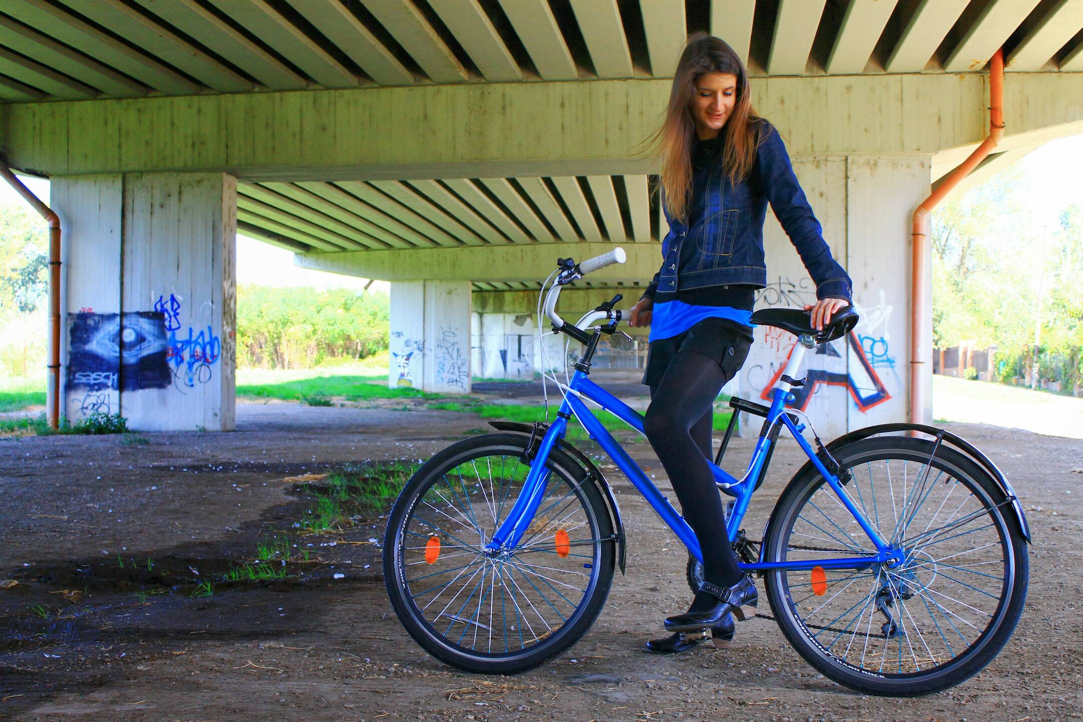 4 Háát... találhattatok volna jobb helyet is a fotózásra, ha már felüljárós témát akartatok, vannak helyek, ahol jobb graffitik vannak... a bringa átlagos, plusz eláll rajta a hátsó sárvédő, és hamár a kormány és nyeregcső fehér, lehetett volna még valami is fehér. Hajni viszont csinos, mindenképp hozzáad a kép értékéhez