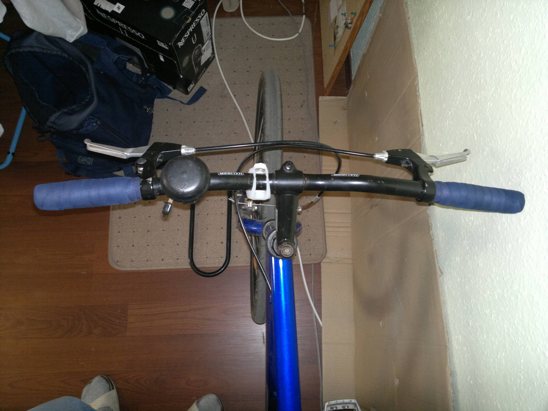 A fekete gumi markolatot is cseréltem, erre a kék, zselés BBB bandázsra, amiből egy fél tekercser sikerült szereznem, ultra low-cost bringára tökéletesen megteszi. Cserébe sokkal kényelmesebb. :)