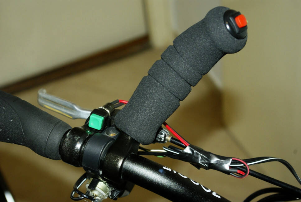 Vekker csengő a kormány alatt. Áramforrás az agydinamó, az egyenáramot lekötöttem az egyik lámpáról, mert lusta voltam még 4 diódát bekötni. Két gomb van, a kétféle kormány fogáshoz. A kormányszarv ebben a fazonban nagyon jól jön szembeszélben meg egyenesekben ahol épp nincs semmi kátyú és forgalom.