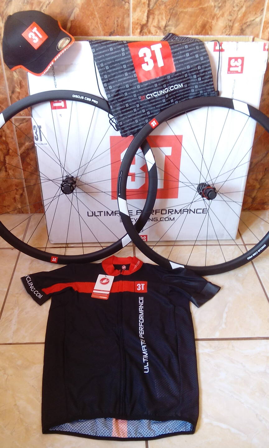 Megérkezett a 3T Cycling márka nagyköveti csomagom: a 2016-os legújabb fejlesztésű Discus C35 Pro kerékszettel, Team mez,pódium felxfit sapka és fan tatyóval.
