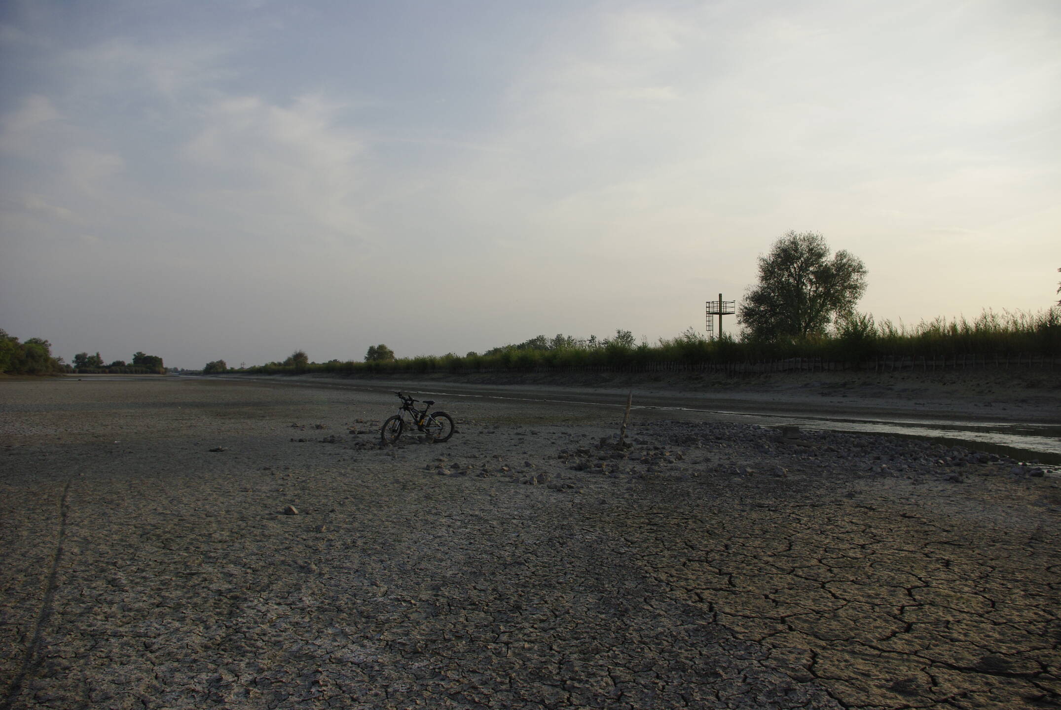 Szeged Matyér kajak-kenu pályáról a víz leengedve, 2018.09.07. A pecázós oldalon olyan száraz, hogy elég nagy helyen bringázni lehet, bár nem végig. Arra tippelnék, a másik oldalon is leérne az evező vége.