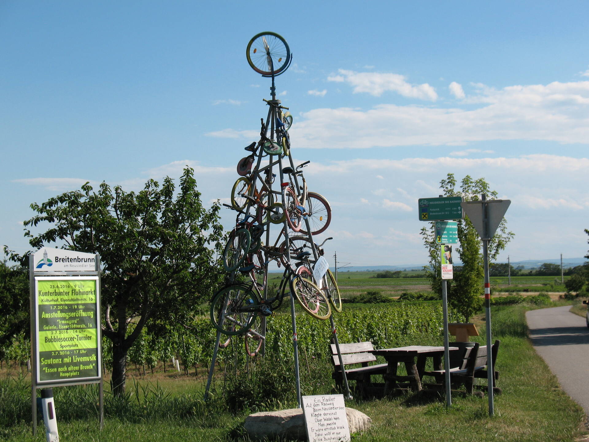 @meszab: Ez Osztrák oldalon van a Fertő-tó mellett. Nem tudtuk kibogozni a tábla feliratát, de biztosan valami világméretű bringás eseménynek tisztelegnek az alkotással. :)