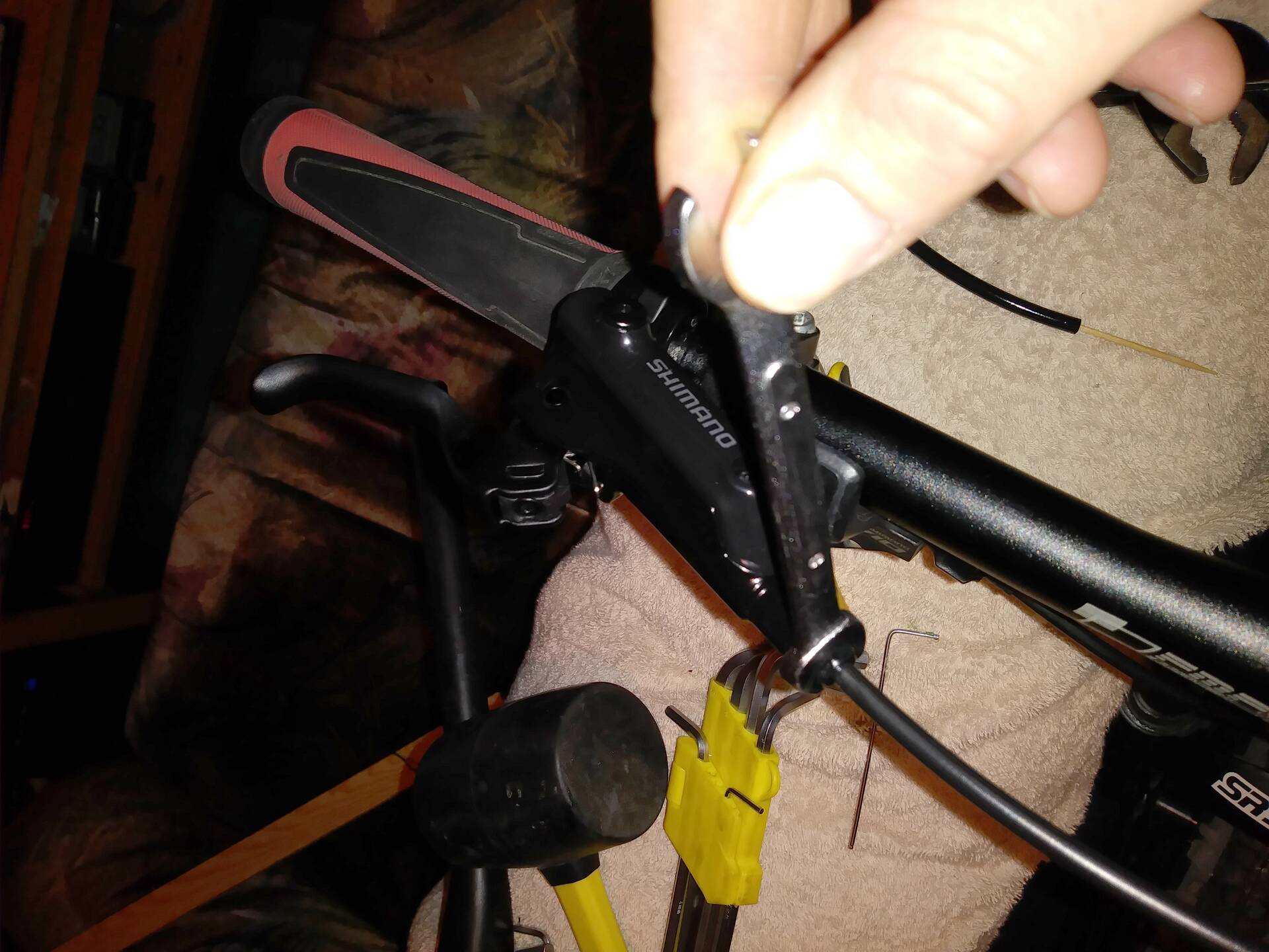 Sajnos a fékcső rövidítést nem tudtam fotózni mert mindkét kezemre folyamatosan szükségem volt, de a záróanya ráhúzásánál szimbolikus jelleggel készítettem egy képet. A lényeg annyi hogy kb 20 centi cső került levágásra. Úgy csináltam hogy a levágott csődarabból se szökjön el az olaj, mert az összeszerelés után belőle pótoltam a légtelenítéshez szükséges mennyiséget. (Mivel fékcsövet rövidíteni anélkül hogy levegő kerülne a rendszerbe, eléggé kivitelezhetelennek tűnik számomra..) Szóval egy fogpiszkálót dugtam a cső végébe, és amikor levágtam nem folyt el belőle semmi. Mint amikor a teli szívószál tetejét befogod és a folyadék benne marad. Így aztán teljes joggal mondhatom hogy egy csepp fékolaj sem ment kárba. :D A háttérben büszkén pózol a gumikalapácsom és egy rakat imbuszkulcs, valamint egy mindkét oldalán fogpiszkálóval lezárt fékcső-csonk! :D