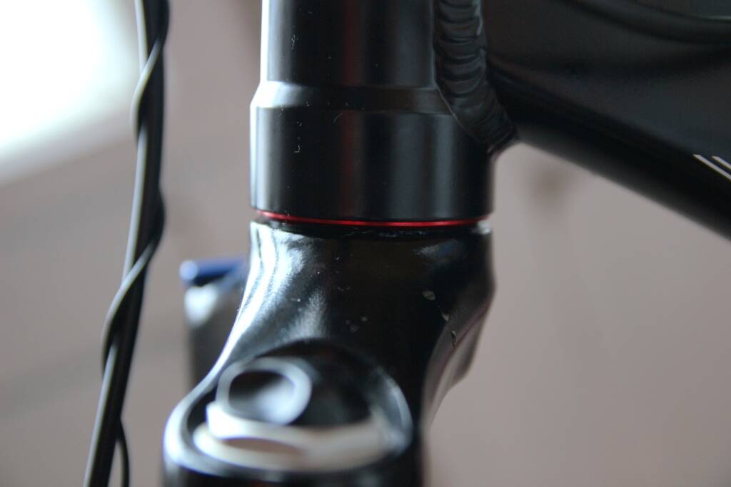 Nagyon tetszik hogy a régi 1 1/8-os fejcsövem után ez a 44mm-es egy vonalban van a villaváll tetejével. Nincs bazi nagy alsó és felső csésze ami megtöri a vonalakat, csak egy apró kis csík látszik az egész csapágyból alul. Sokkal letisztultabb látványt nyújt ez a félintegrált megoldás.