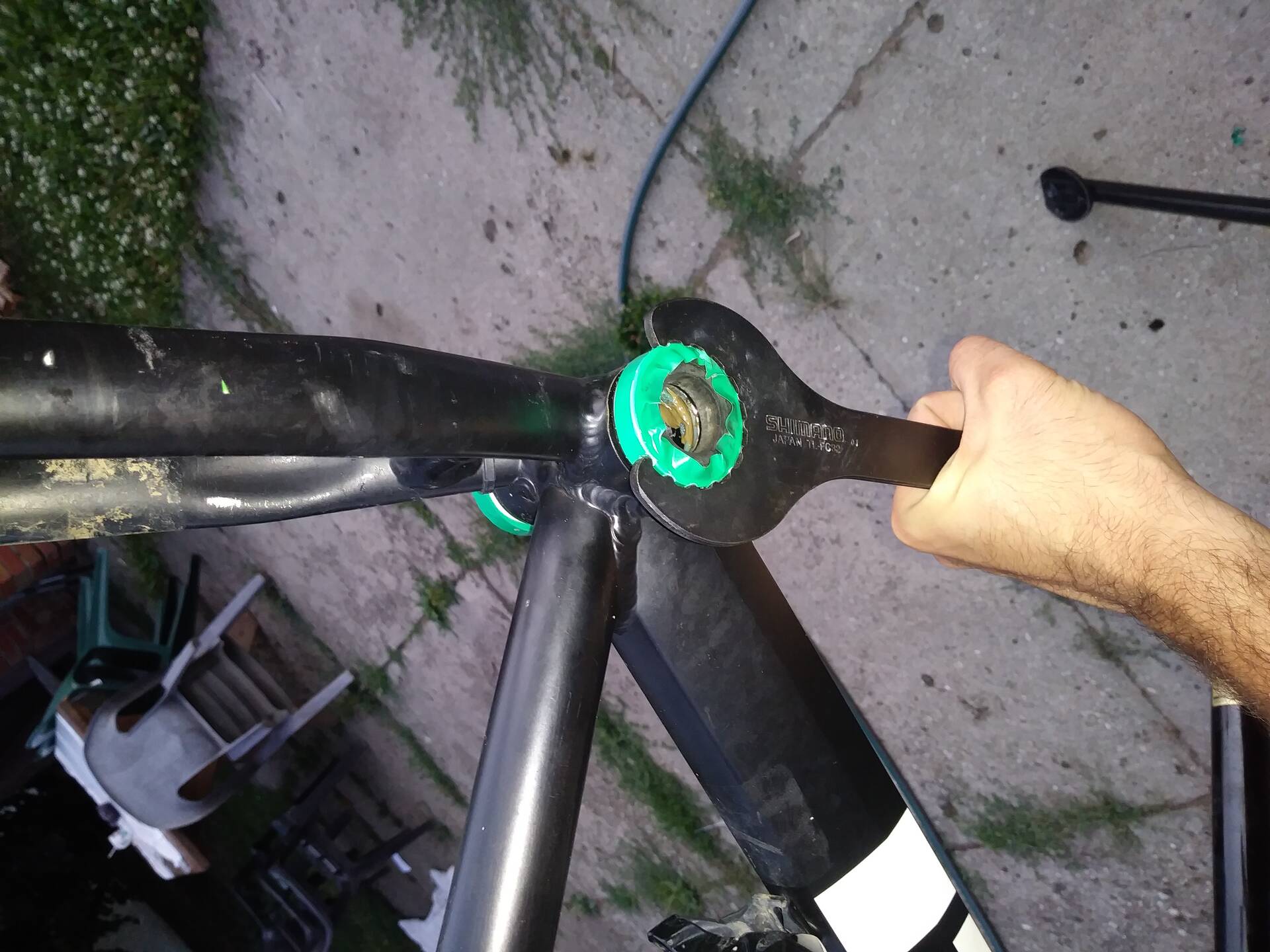 Szóval volt a Bükk maraton. A cimborám gépe kicsit megsínylette a sarazást (de főleg a magasnyomású felelőtlen használatát a verseny után hazafelé menet), így nálam maradt egy nagyszervízre. A középcsapágy totálisan beállt, a kormánycsapágy recsegett és úgy az egész masinára már időszerű volt ránézni jobban. Itt a középcsapágyat hajtom épp ki. Betekertem szigszalaggal a csészét hogy ne karcoljam össze, hátha tudok bele életet lehelni és kitolni még kicsit a szolgálati idejét...