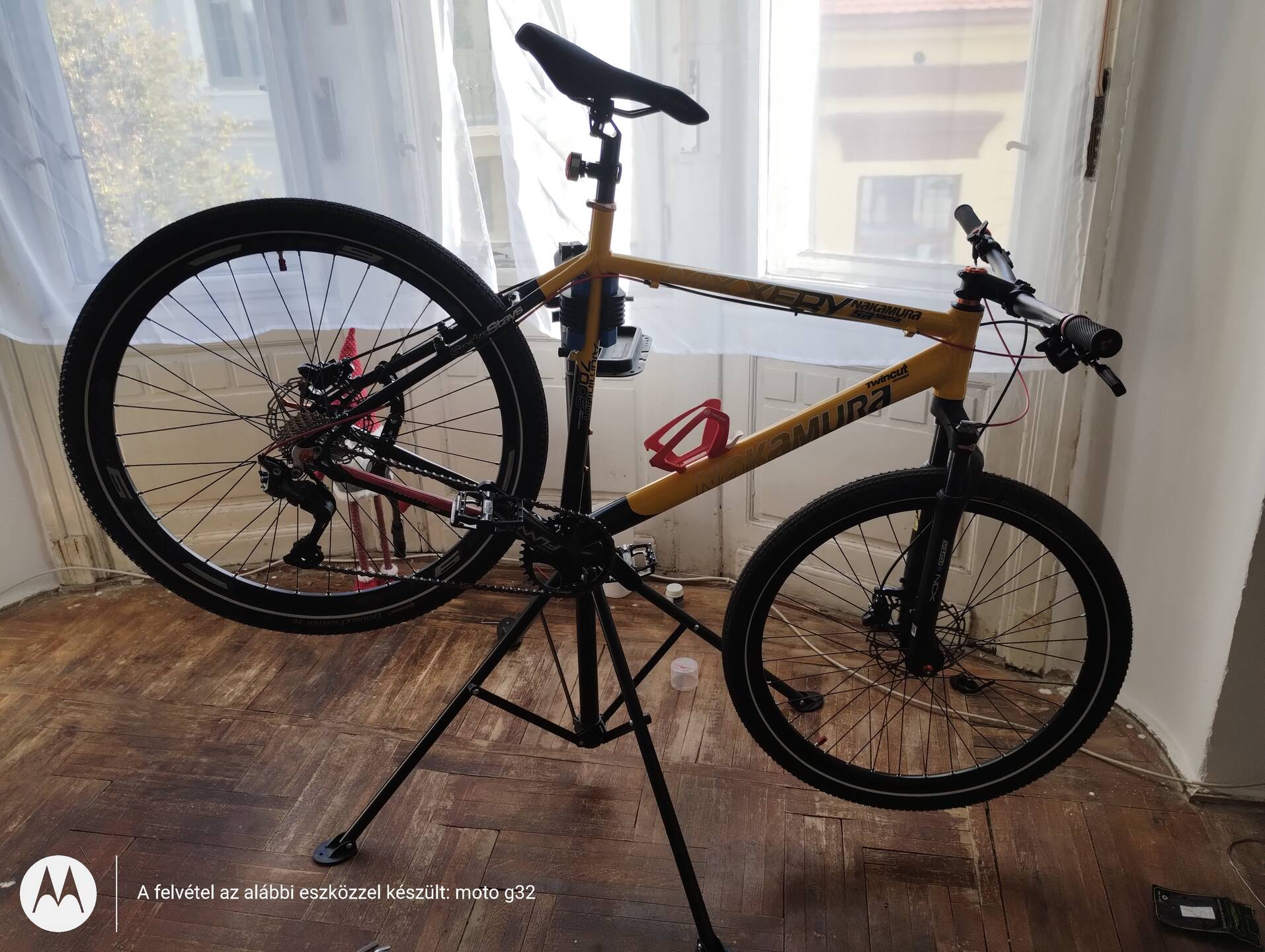 Itt még piros bowdenházzal, később ki lett cserélve az egész, mert túl rövidnek bizonyult, így túlságosan feszült a váltó. Fekete Shimano OptiSlick házat és teflonos Shimano bowdent kapott. Képet még nem csináltam, mert borús az idő.