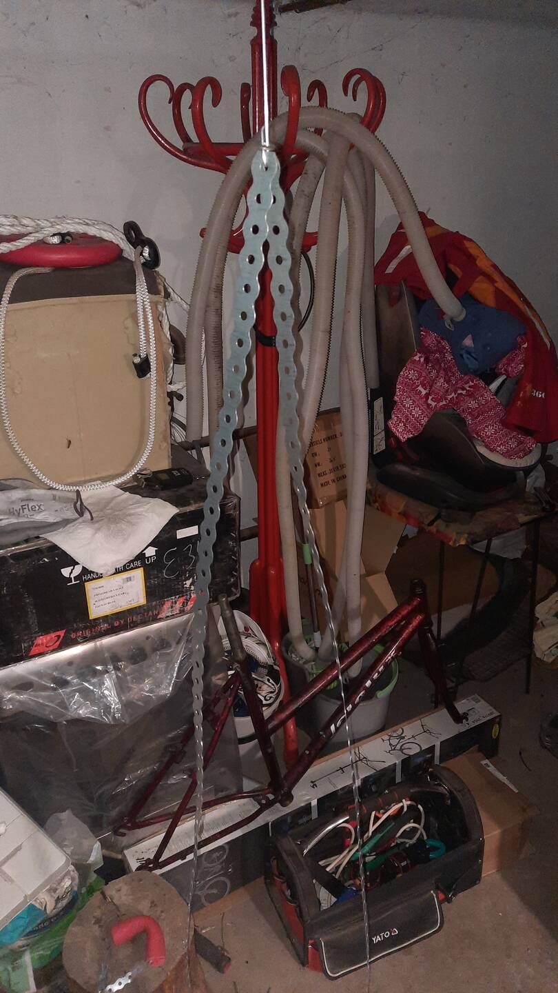 Utána egy karabínert - ami a födémhez csatlakozik - kifúrtam, abba rögzítettem a küllő anyás végét, a másik végére meg egy ilyen hilti szalagos-kengyeles taknyolást követtem el, hogy a súlyommal - amit ismerek - előfeszítsem a küllőt.