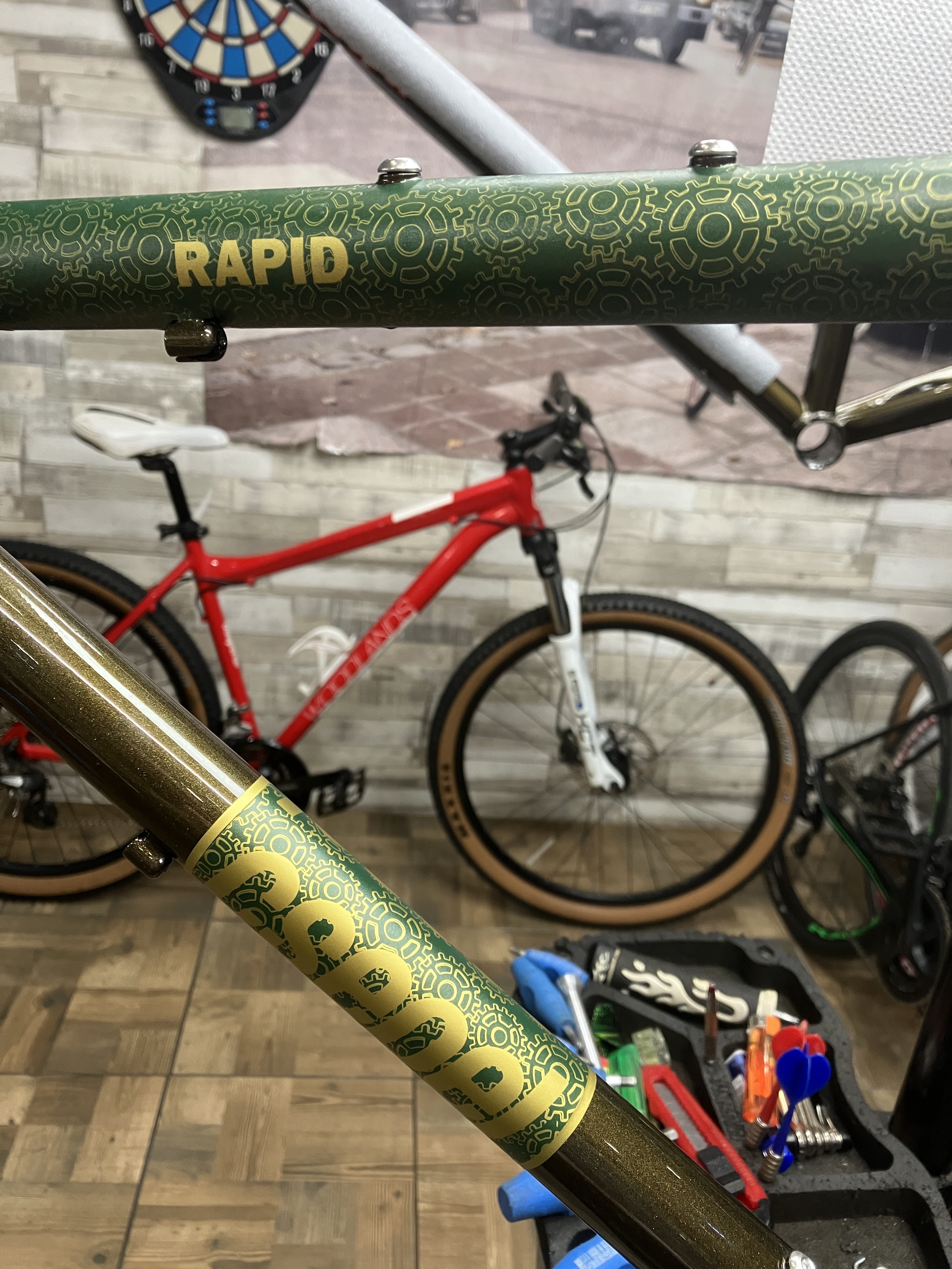 Egy hegesztés hibás volt a vázon, így Ricsi cseréltette gariban. Ha már meglátogattam, egy szintén nyíregyi dekoros barátommal megcsináltuk rá az új sztájlt. Mert szép szín a piros, csak nem ezen.