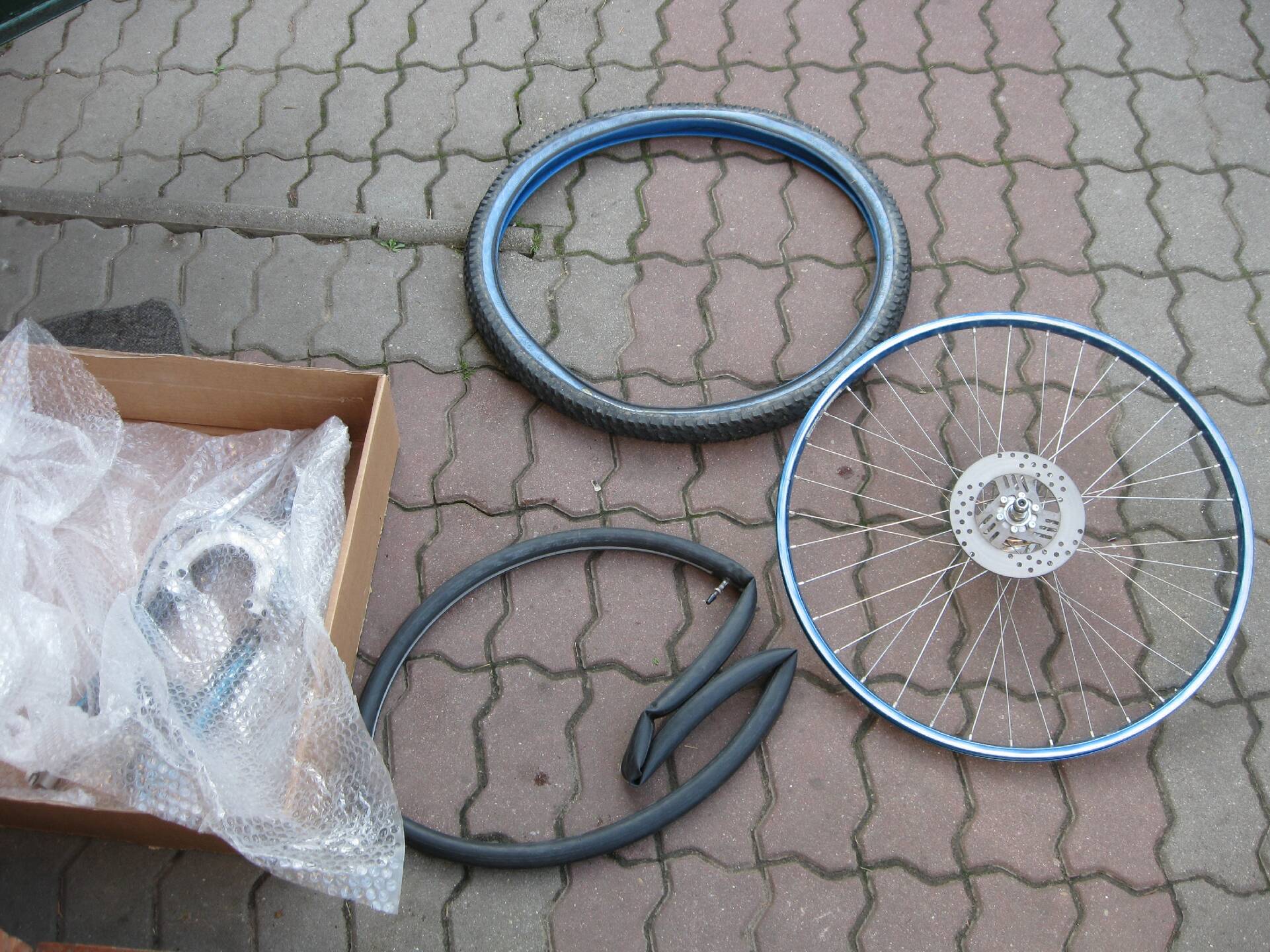 Bike-tech eloxált kék felni Sachs tárcsafékes aggyal és Sachs féktárcsával, Schwalbe Black Shark külső, Schwalbe belső.