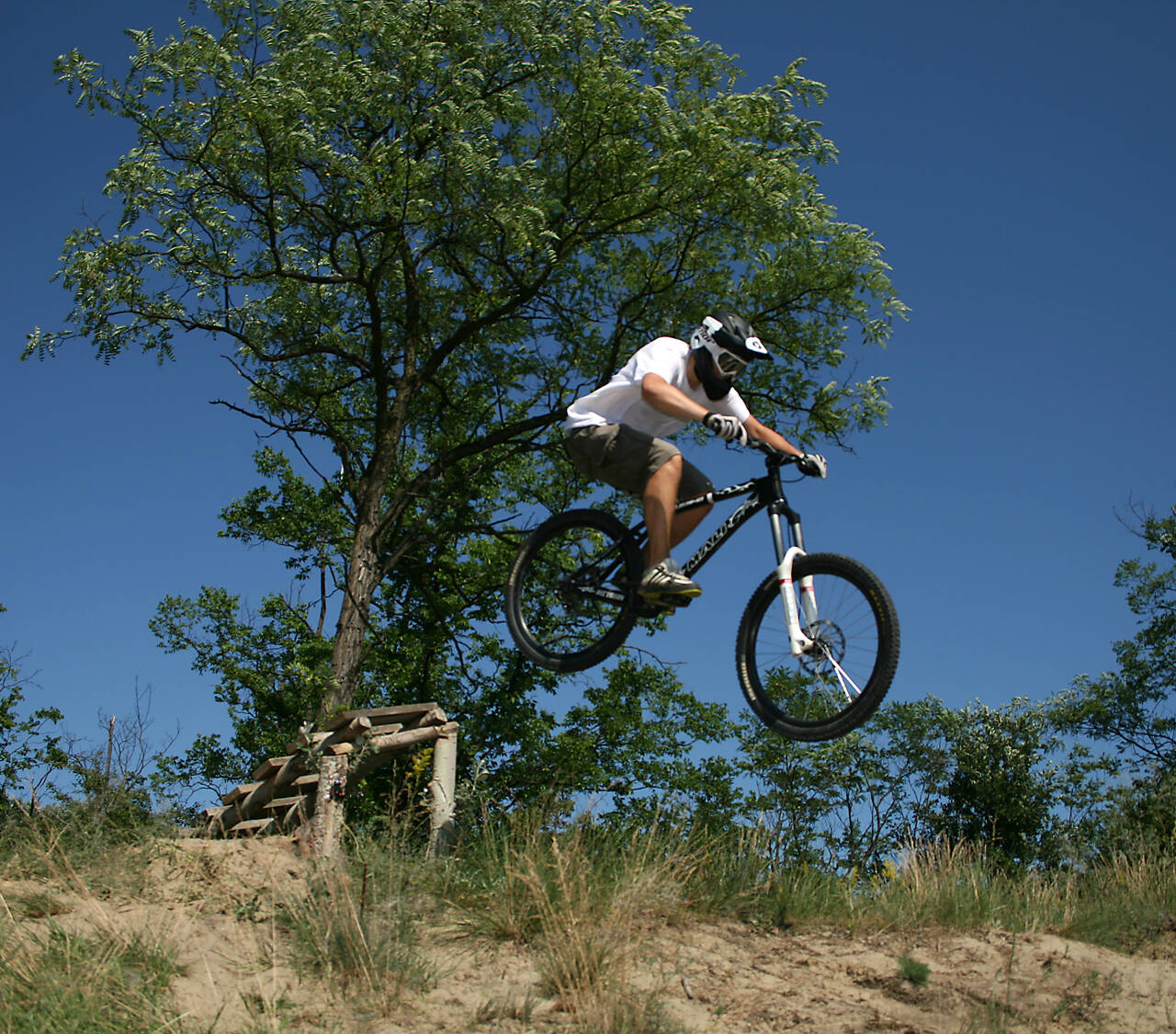 @viktor123: Hát elég bonyolult a dolog :D Szal a fényképezőt,vakut beállítom állványra és egy távkioldót beteszek a gép elé (az ugró bal szélén a fekete dolog :D ) erre egy szervót ragasztok úgy, hogy ha elfordul lenyomja a gombot és a távkioldó elsüti a gépet. A szervót egy távirányító működteti, aminek az egyik karjára egy cérnát kötöttem, ennek a cérnának a másik vége egy karóhoz van kötve, és a cérnát kifeszítem az ugró előtt. Ha jövök a bicóval, elszakítom a cérnát, a távirányító botja visszaugrik és a szervó elfordul és lenyomja a távkioldó gombját-> kész a kép! :D