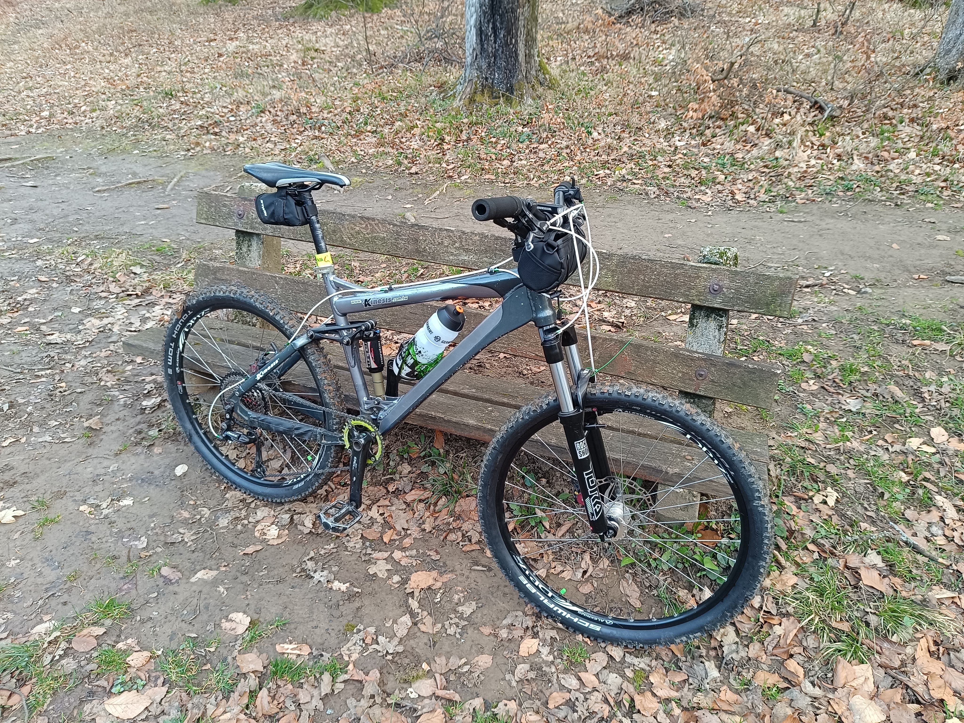 Kinesis aluvázra épített fully. A vázat használtan vettem, az alkatrészei alapján 2008-2010 körüli gyártmány lehet, de a neten nyomát sem találtam a típusnak.